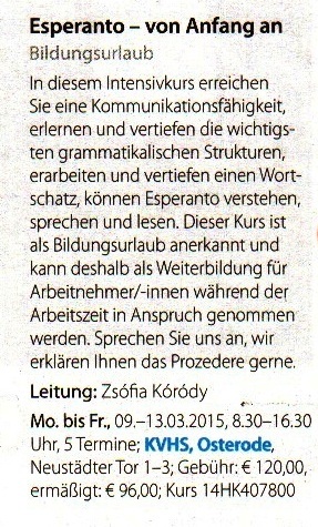 Aliĝu ĉe la Popolaltlernejo KVHS Osterode. Jen la alvoko (en la germana) el la programkajero de la popolaltlernejo kaj la provizora programo 4-8 marto 2013 en KVHS Osterode am Harz